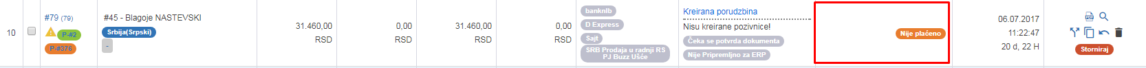 Korak 2: U okviru polja za prikaz porudzbina potrebno je prvenstveno proveriti da li je korisnik platio porudžbinu. Ukoliko korisnik nije izvršio plaćanje porudbina će biti prikazana kao na sledećoj slici: