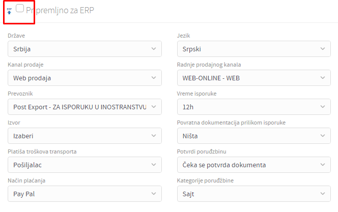 Korak 4: Nakon odabira radnje potrebno je u okviru dela Priprema za ERP obeležiti da je porudžbina pripremljena za ERP kao što je prikazano na slici: