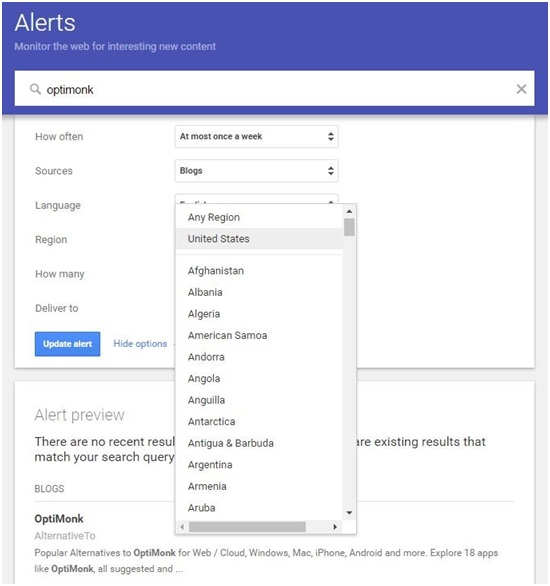 Veoma je lako postaviti ova upozorenja. Potrebno je samo da unesete svoje ime (ili bilo koji drugi izraz) i da izaberete izvore ptrage (blog, video, vesti, itd.).