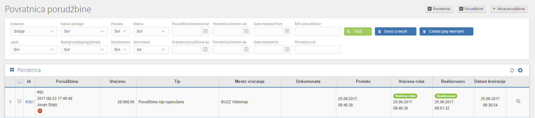 Korak 7: Nakon pristupa modulu Povratnice porudžbine mogu se dobiti informacije o svim kreiranim povratnicama. Na slici je prikazan modul povratnice porudžbina kao i mogućnosti koje on sa sobom daje: