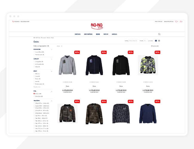 No-no Club je internet prodavnica moderne odeće za decu domaće proizvodnje, sa tradicijom dugom skoro 40 godina. Zasnovana na NB SHOP platformi, uz povezivanje sa kurirskom službom i mogućnost kartičnog plaćanja, kupcima je omogućena laka i sigurna online kupovina iz širokog asortimana trgovca.